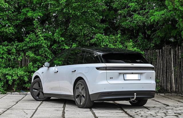再来看车尾部分,掀背式尾门是尾部最大亮点,1655mm高度与1.1米进深的后备厢开口,兼顾了造型实用性与装载便利性。贯穿式尾灯组采用「光刃」设计,内部嵌有理想品牌英文标识,夜间点亮时与前脸「X」型灯组形成呼应。后保险杠底部扩散器并非性能噱头,实际可提升高速行驶稳定性,而原厂预留的拖车钩接口(支持1.5吨拖挂)则拓展了户外场景可能性。